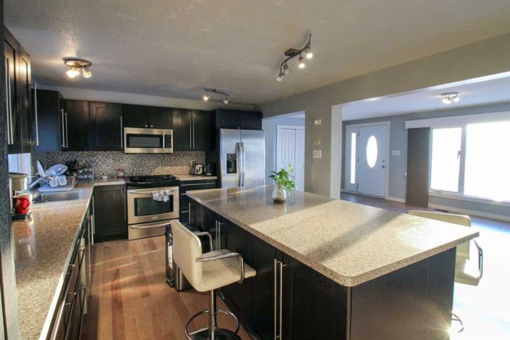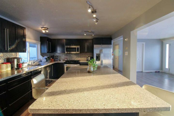 4-bedroom house on a corner lot - has professionally installed hardwood flooring (2024), which extends through the main living areas and both bedrooms on the main floor. At the heart of this 4-bedroom home is a spacious kitchen featuring rich espresso cabinetry, Silestone countertops, a tiled backsplash, and stainless-steel appliances. The oversized island is perfect for baking or entertaining family and friends. Enjoy year-round comfort with central AC and a 16’ x 28’ detached garage, complemented by an impressive amount of exterior concrete for ample outdoor parking. The warm basement—added in 2007—features large windows, two bedrooms, and a generously sized family room, creating valuable additional living space. The home has may updates and recent improvements! Both bathrooms (main and basement) are 4-piece. Exterior upgrades include new shingles, siding, windows, decks, and window wells. Move-in ready and full of potential, this property offers a solid opportunity for a wide range of buyers— move in now- or add only a few finishing touches to make it truly shine.